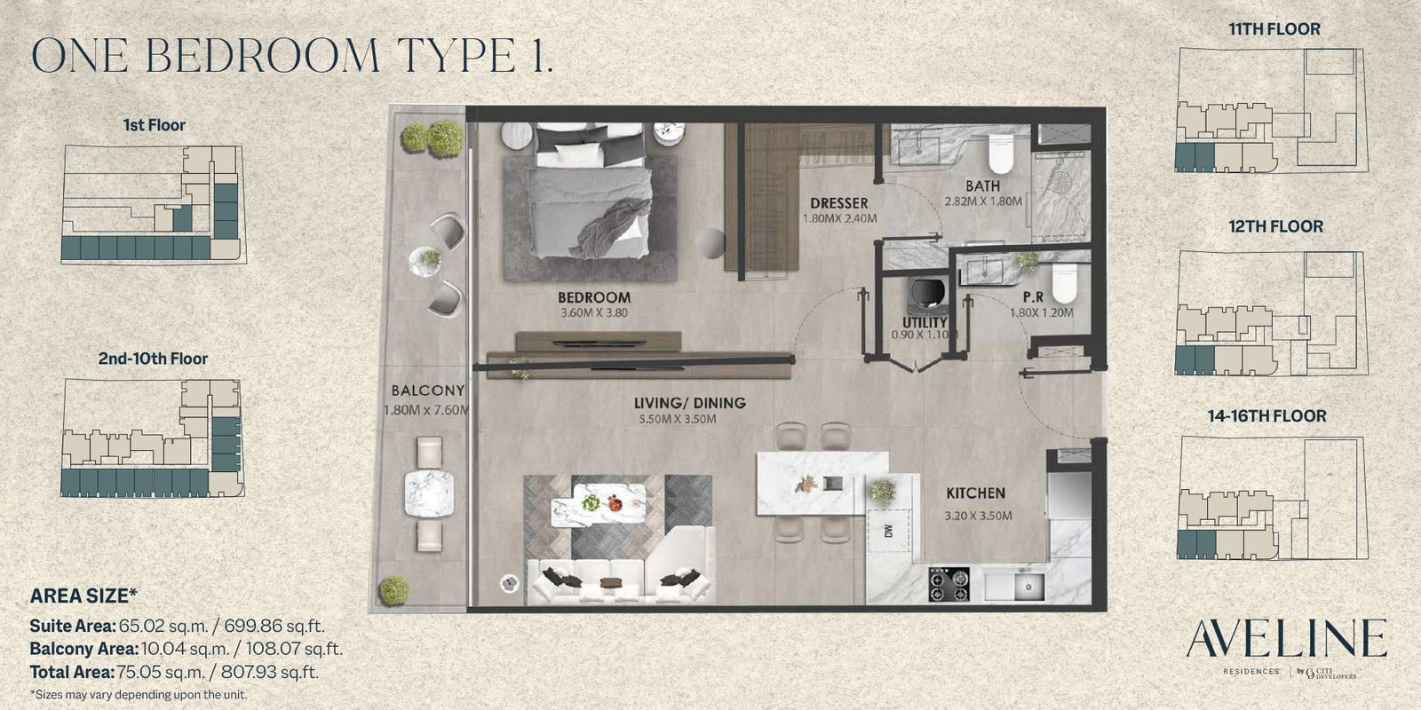 1st-16th Floor - Type 1 807.93 Sq Ft Apartment