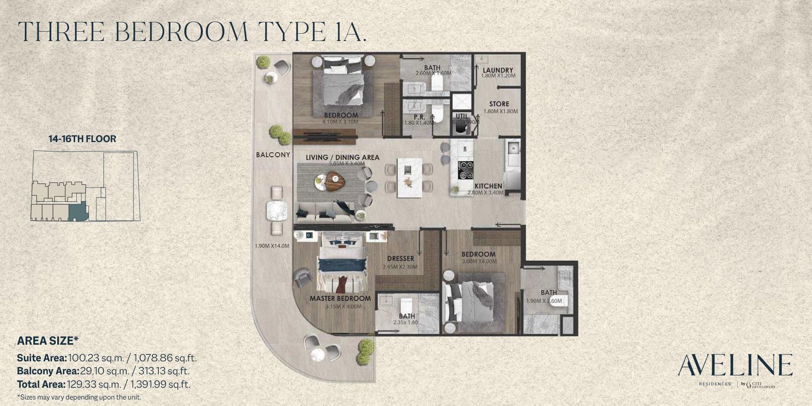14th To 16th Floor - Type 1A 1391.99 Sq Ft Apartment