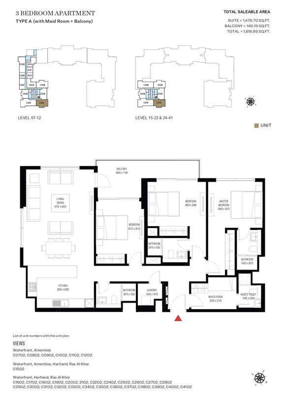 3 Bedroom | - | Type A (with Maid Room + Balcony) | 1616.85 Sq Ft | Apartment |