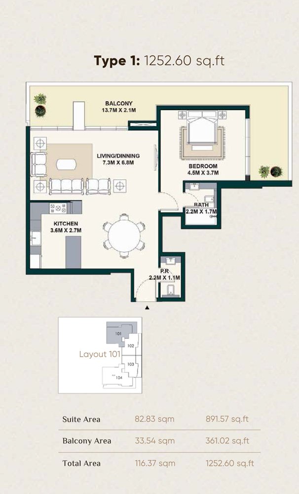 1 Bedroom | - | Type 1 | 1252.60 Sq Ft | Apartment |