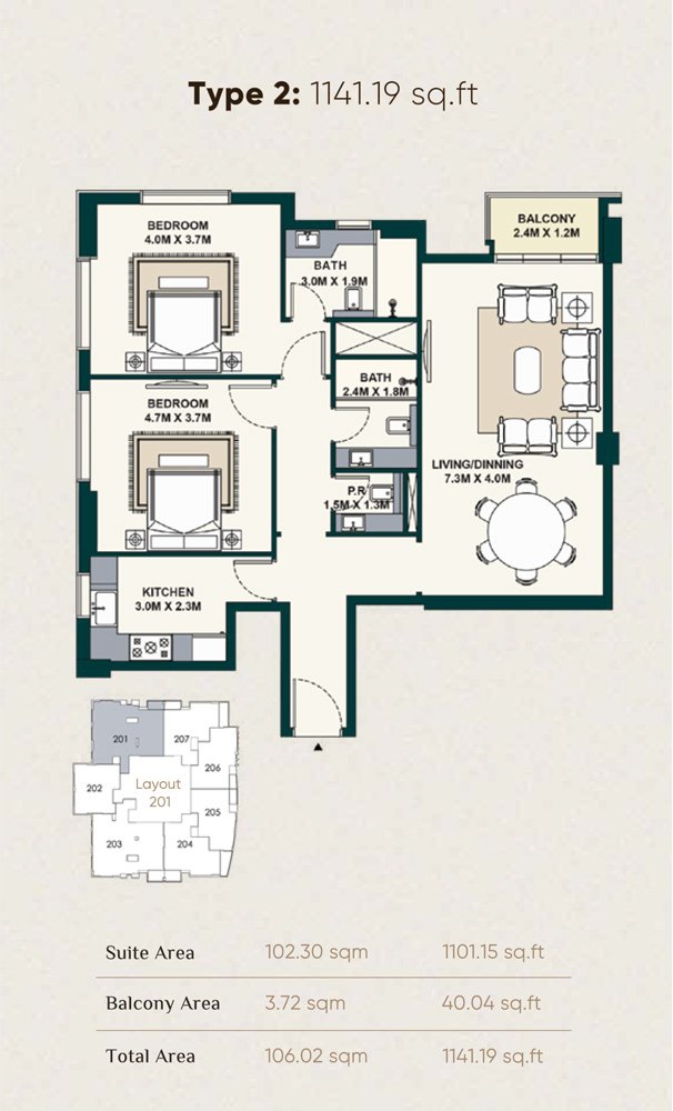 2 Bedroom | - | Type 2 | 1141.19 Sq Ft | Apartment |