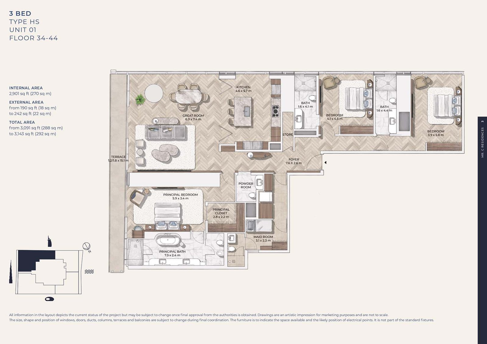 FLOOR 34-44 - TYPE HS (UNIT 01) 3143.00 Sq Ft Apartment