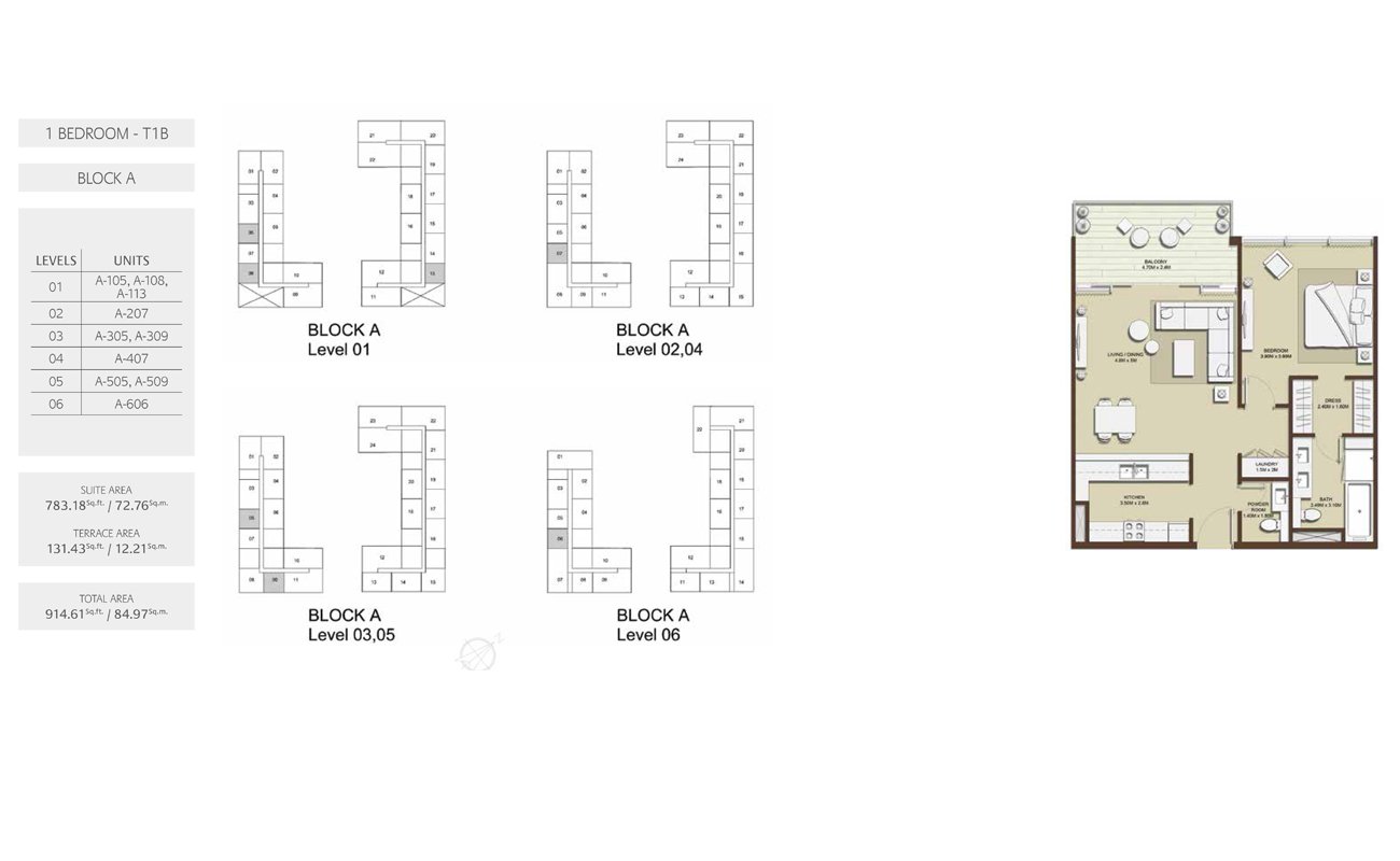 1 Bedroom | - | 1 Bed-T1B-Block-A, Size-914.30 sq.ft | 914.30 Sq Ft | Apartment |