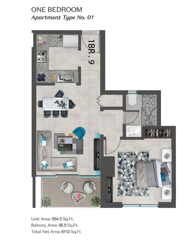 1 Bedroom | - | 1-Bedroom-Apartment,Type-1,Size-611 Sq Ft | 611.00 Sq Ft | Apartment |
