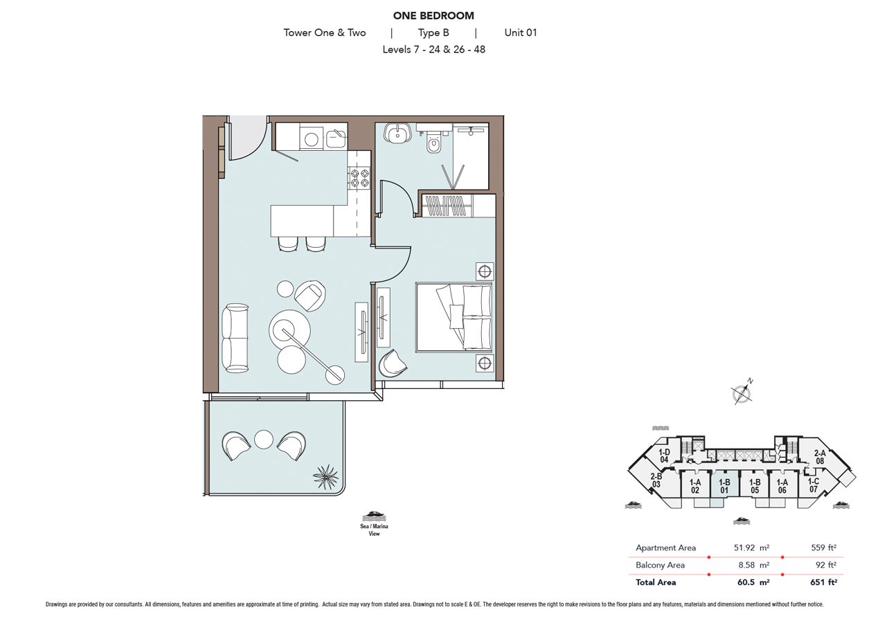 Tower 1 & 2 - Type B, Unit 1 651.00 Sq Ft Apartment