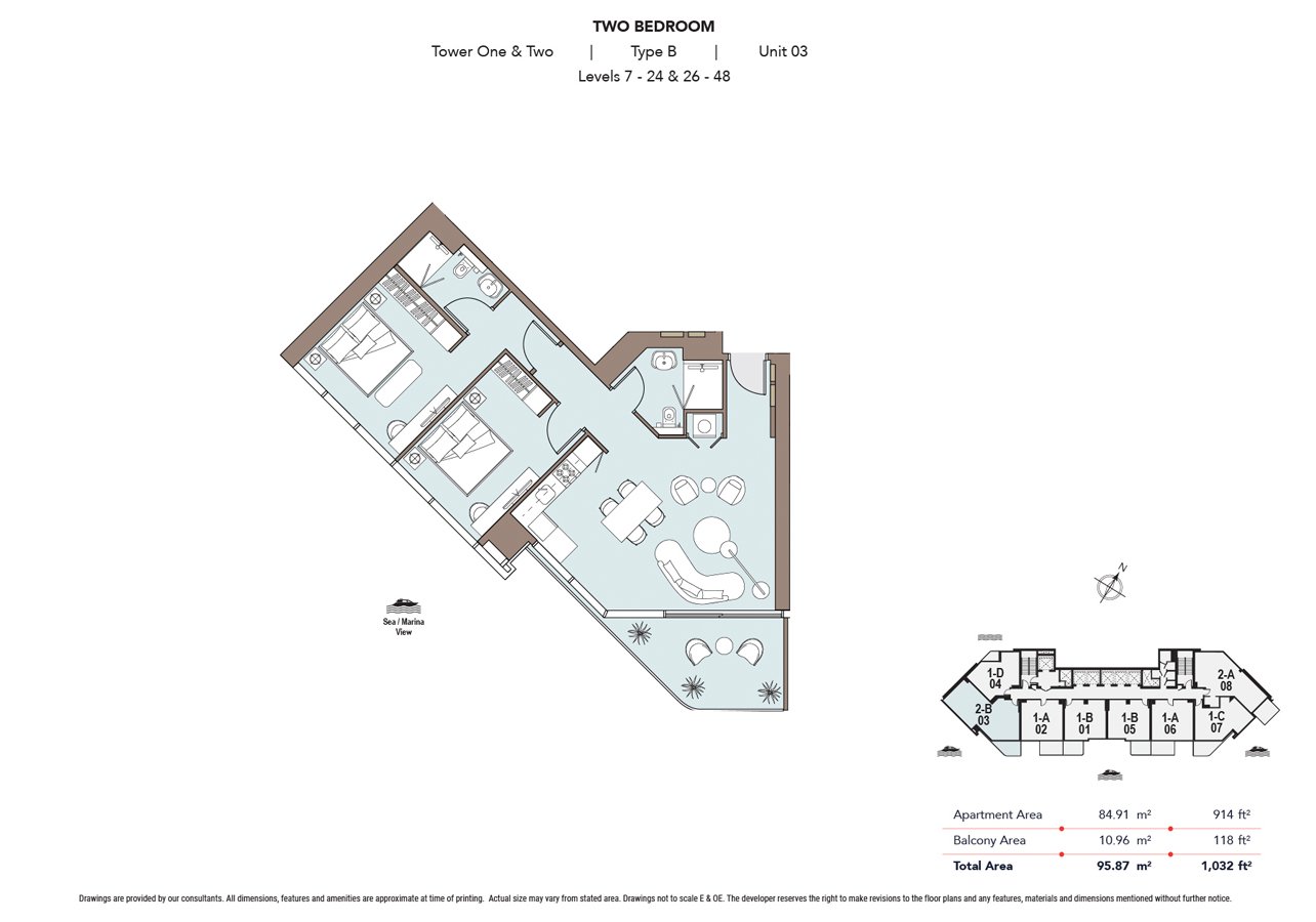 Tower 1 & 2 - Type B, Unit 3 1032.00 Sq Ft Apartment