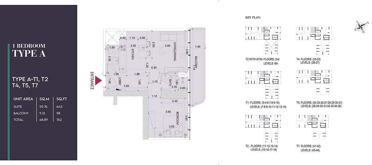 1 Bedroom - Type A-T1,T2,T4,T5,T7 742.00 Sq Ft Apartment