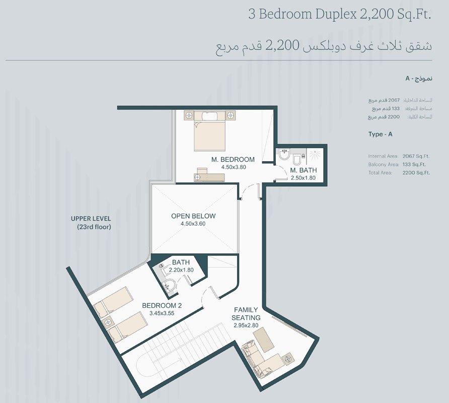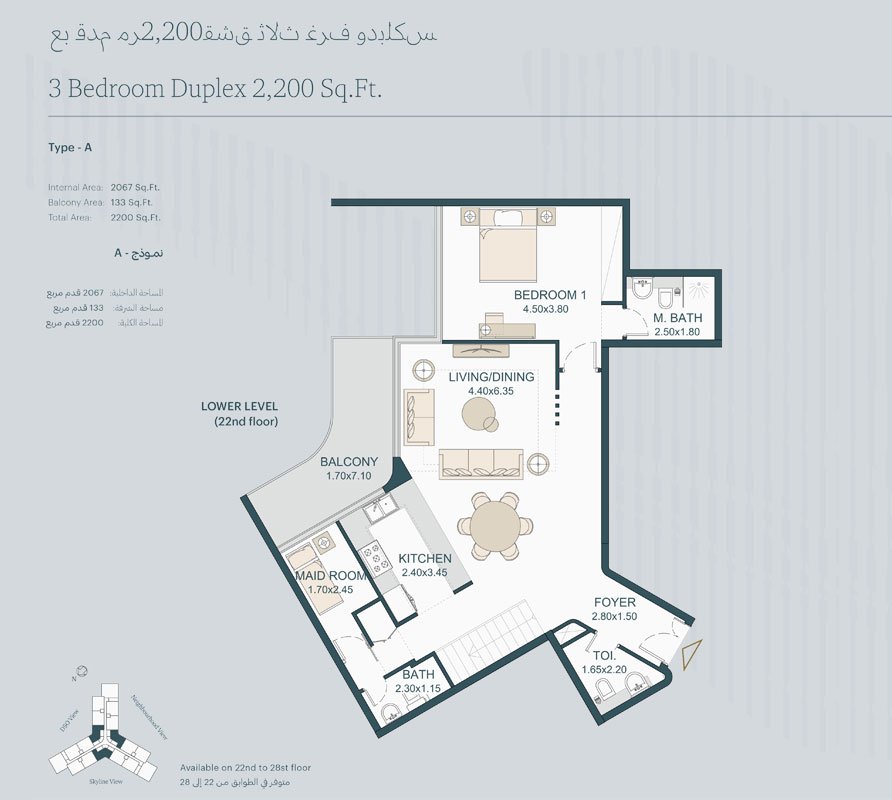 3 Bedroom | - | Duplex, Type A, Lower Level (22nd Floor) | 2200.00 Sq Ft | Apartment |