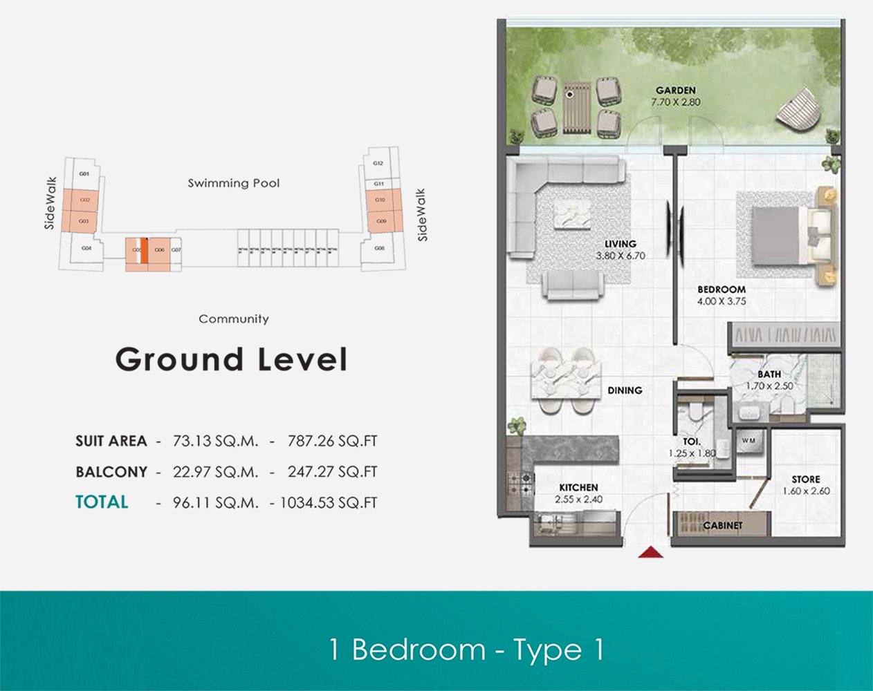 1 Bedroom - Type 01 1034.53 Sq Ft Apartment
