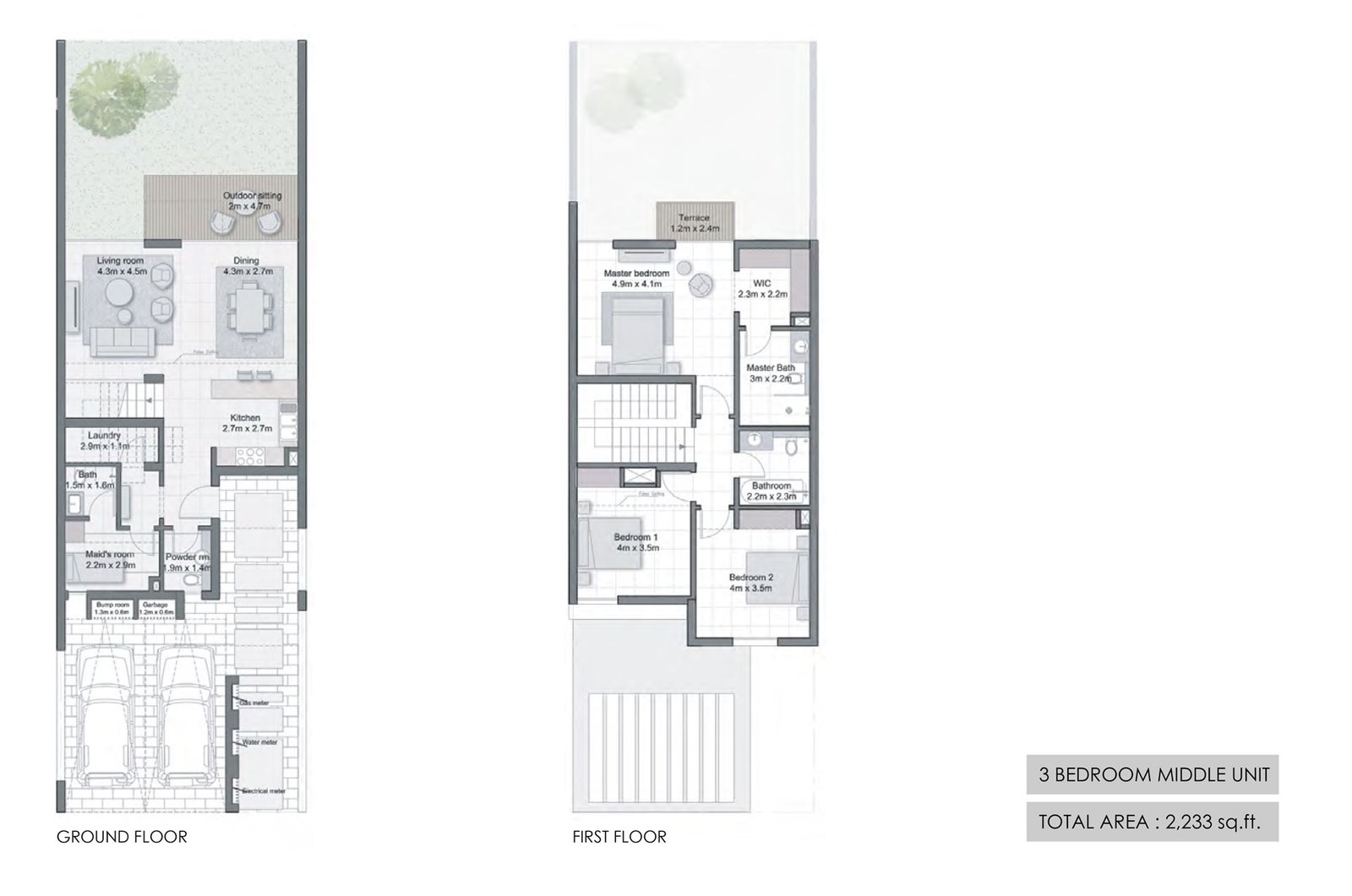 3 Bedrooms - 3 Bedroom Middle Unit Size 2233 sqft 2233.00 Sq Ft Townhouse