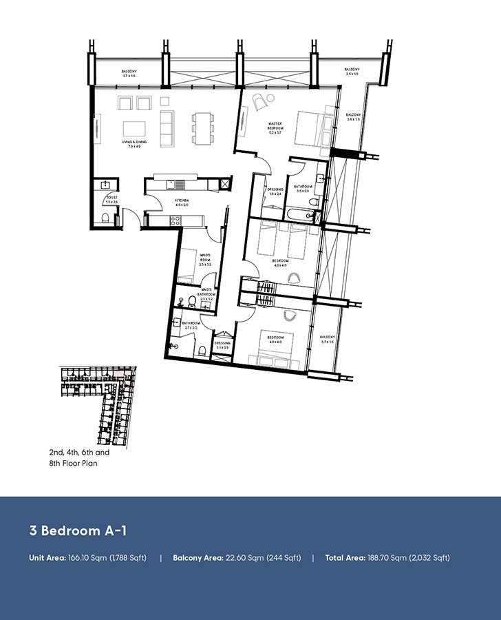 3 Bedroom | - | Type A-1, 2nd, 4th, 6th and 8th Floor Plan | 2032.00 Sq Ft | Apartment |