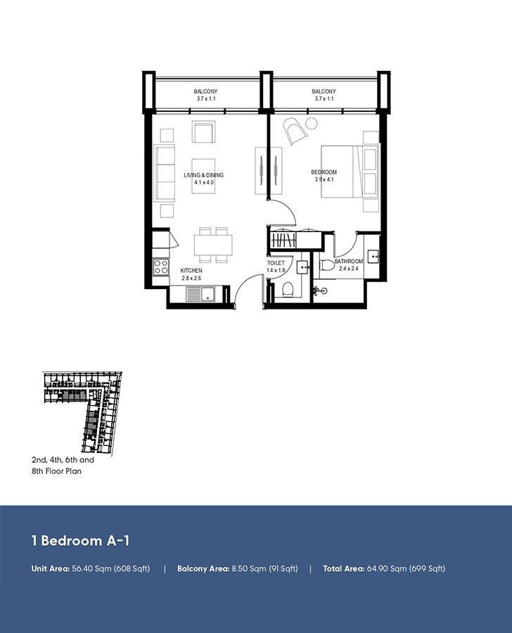 1 Bedroom | - | Type A-1, 2nd, 4th, 6th and 8th Floor Plan | 699.00 Sq Ft | Apartment |