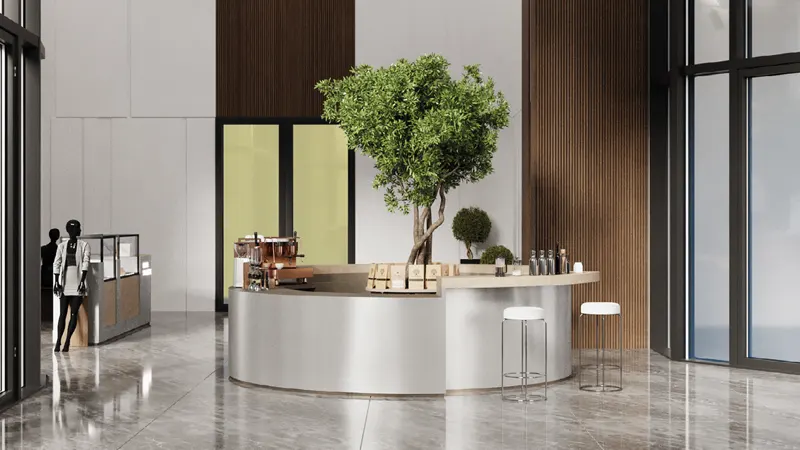 Sleek glass-fronted offices and retail zones buzzing with business energy.