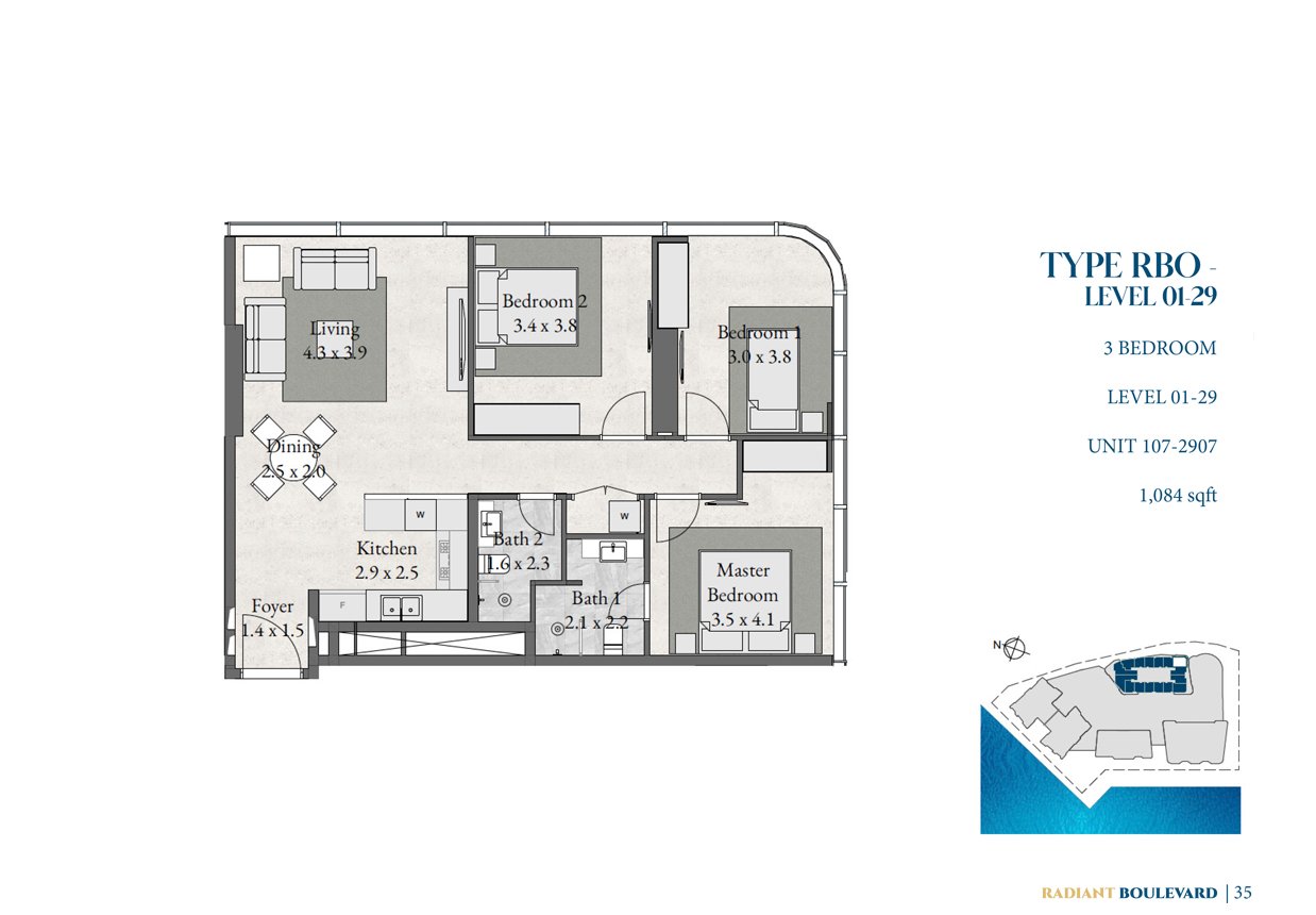 3 Bedroom | - | Type - RBO, Level 1-29 | 1084.00 Sq Ft | Apartment |