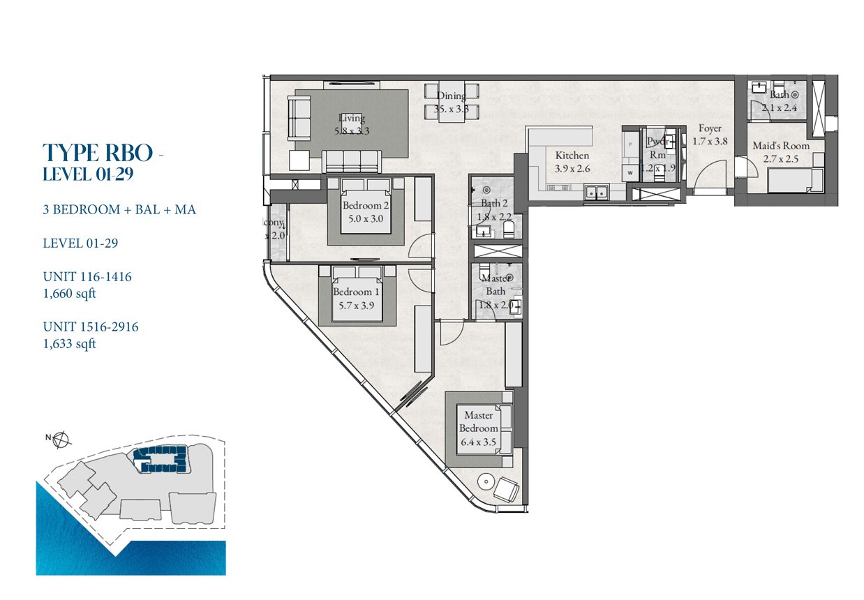 3 Bedroom | - | Type - RBO, Level 1-29 | 1660.00 Sq Ft | Apartment |