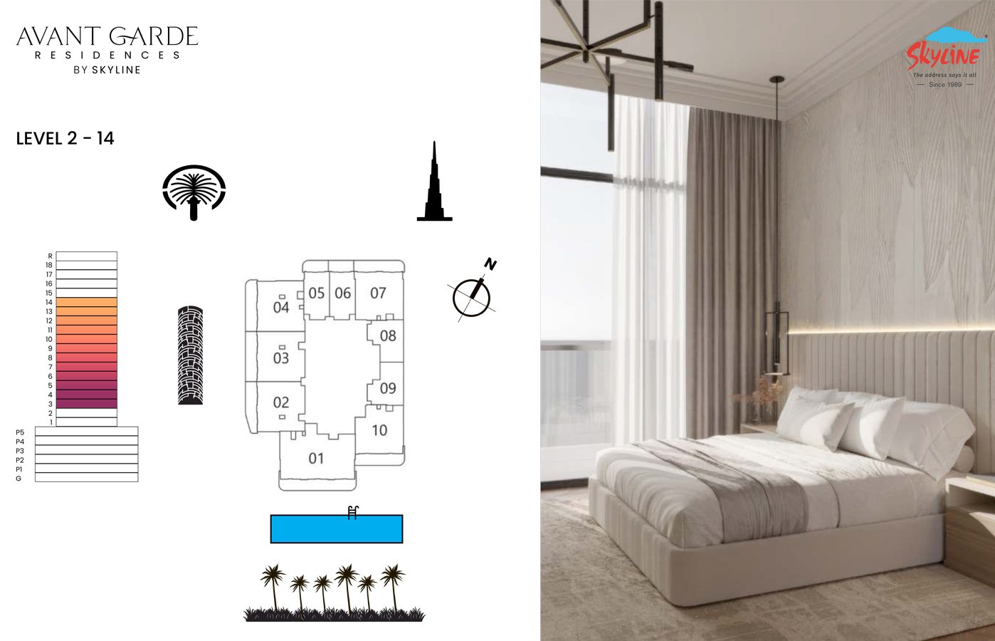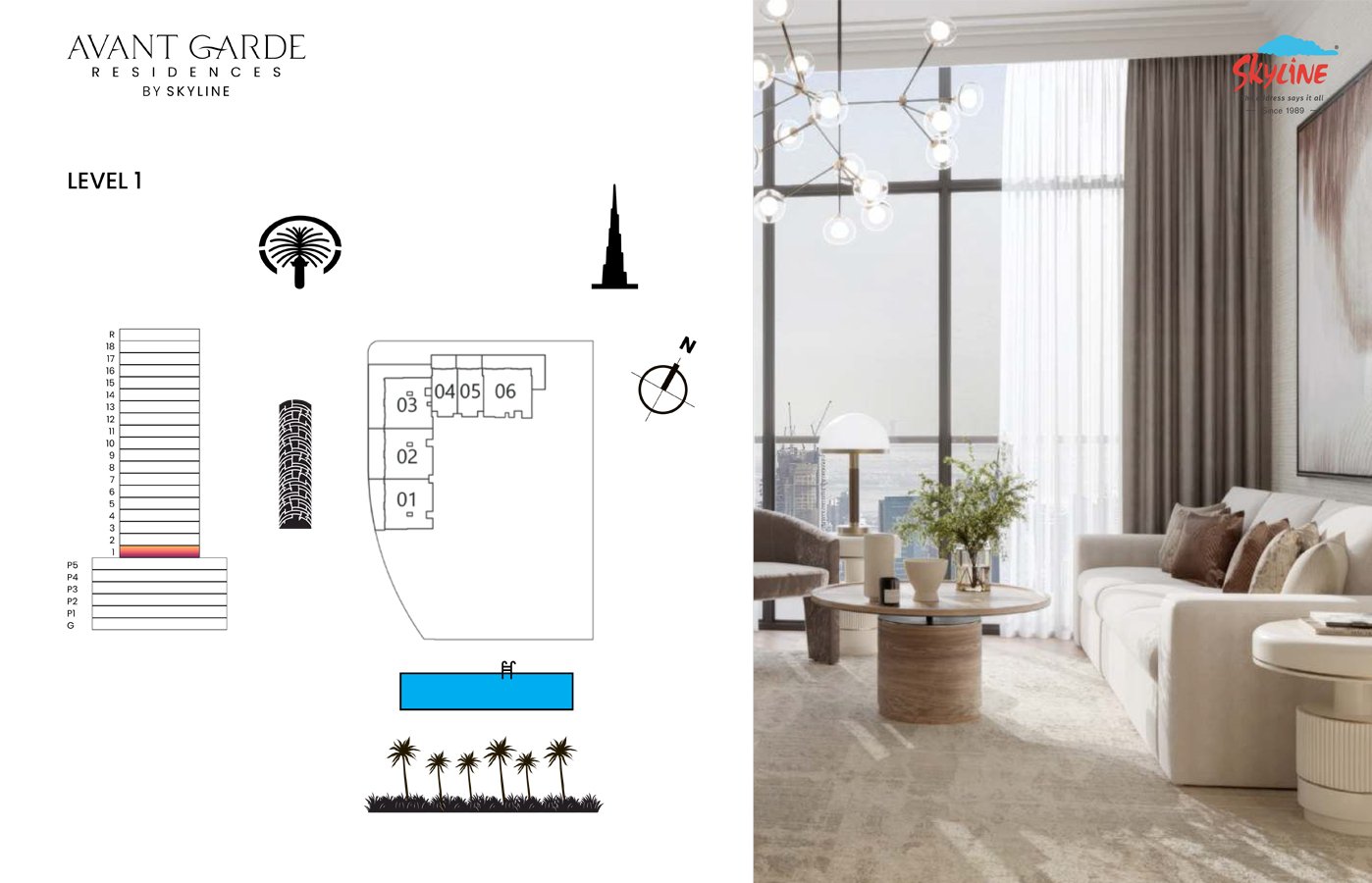 Discover an unparalleled standard of luxury living at Avant Garde Residences by Skyline Builders, situated in the vibrant heart of Dubai's JVC. This prestigious development features elegant studios, as well as one and two-bedroom apartments, all within a striking G+5 podium and 18 floors. Comprising 172 residences and three retail shops, Avant Garde Residences showcases a thoughtfully designed contemporary architectural style inspired by the rolling dunes of the Arabian desert, ensuring optimal views and functional living spaces throughout the building. Residents are greeted by a spacious double-height entrance lobby, adorned with premium materials that establish a tone of sophistication and elegance. Each apartment boasts European interior design, incorporating natural materials and soothing color palettes to create a serene ambiance that balances comfort and style. With a wealth of amenities, including an infinity swimming pool, a rooftop garden, a fully equipped gym, and children's play areas, Avant Garde Residences offers an impressive selection of features designed to enhance every aspect of daily life. Experience the pinnacle of luxury living in Dubai, where exceptional craftsmanship seamlessly blends with unmatched comfort and convenience.