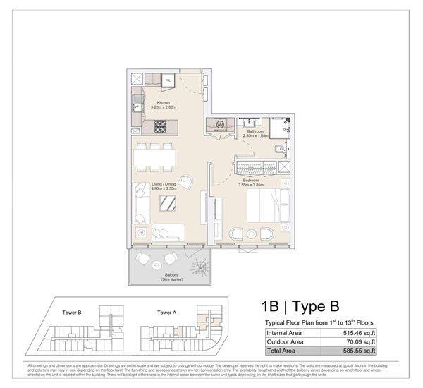 1 Bedroom | - | 1 BR, Type B, Typical Floor Plan from 1st to 13th Floors | 585.55 Sq Ft | Apartment |