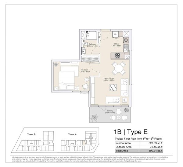 1 Bedroom | - | 1 BR, Type E, Typical Floor Plan from 1st to 13th Floors | 599.34 Sq Ft | Apartment |