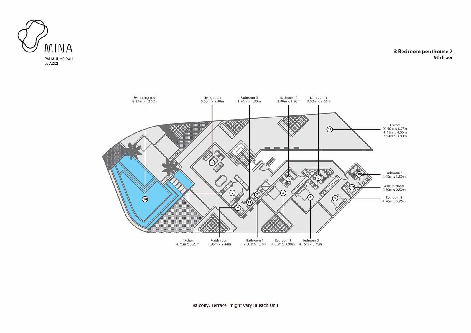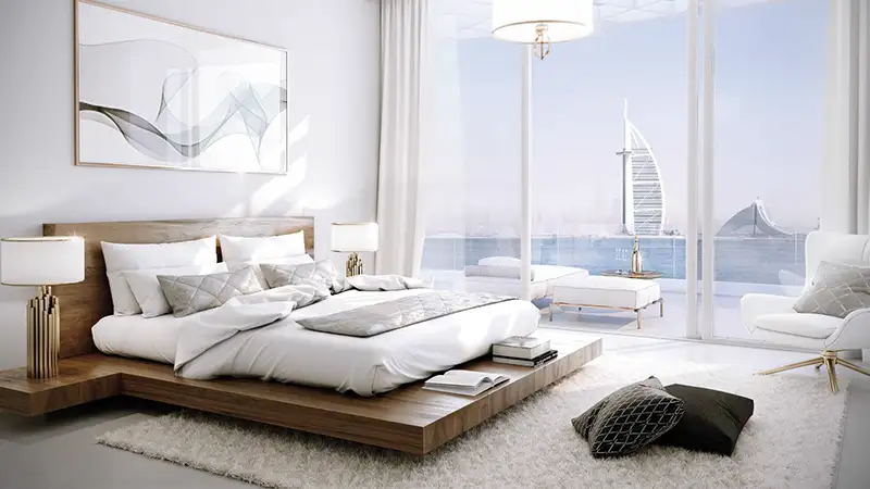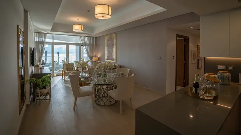 Azizi Mina represents a distinguished residential destination featuring one and two-bedroom waterfront apartments and penthouses situated at the iconic Palm Jumeirah in Dubai. This exclusive locality encompasses a limited collection of 178 luxurious waterfront apartments, nestled by the gentle waves on the shores of one of the world's most coveted addresses. The architecture is a blend of elegance and contemporary design, providing residents with an unparalleled lifestyle enriched by bespoke artistic elements. With breathtaking panoramic views of the city, this location is truly enviable, showcasing the stunning vistas of Palm Jumeirah. The development is committed to sustainability, dedicating 69% of its total area to lush greenery, including gardens, children's play areas, jogging tracks, and outdoor spaces. It promises signature quality assurance, a prime location, captivating views, and exceptional amenities, all embodying an exclusive and privileged resort-style experience. Set against a backdrop of tourist attractions, towering skyscrapers, and a wide array of entertainment and leisure options, residents can indulge in relaxation and recreation, with the added allure of a nearby grand golf course. They also enjoy convenient access to renowned hotels and resorts in the vicinity, including One & Only Hotel, Zabeel Saray Hotel, Kempinski Hotel, Atlantis Hotel, Sofitel Hotel, Waldorf Astoria Hotel, Anantara Hotel, Rixos Hotel, and Dubai Marina. The development provides a range of serviced amenities, such as valet parking, room service, housekeeping, and 24-hour concierge and security. Residents benefit from a personal touch, achieving a harmonious balance of style and sophistication with high-quality standards. Key highlights include stunning views of Palm Jumeirah, round-the-clock security, easy connectivity, a perfect blend of comfort and elegance, top-notch serviced facilities, and a climate-controlled infinity pool.