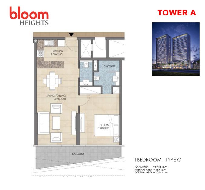 1 Bedroom | - | Tower-A 1 Bedroom Type-C | 69.00 Sq Ft | Apartment |