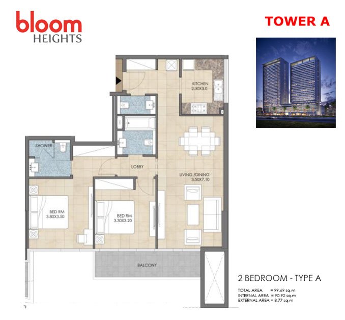 2 Bedrooms | - | Tower-A 2 Bedroom Type-A | 99.00 Sq Ft | Apartment |