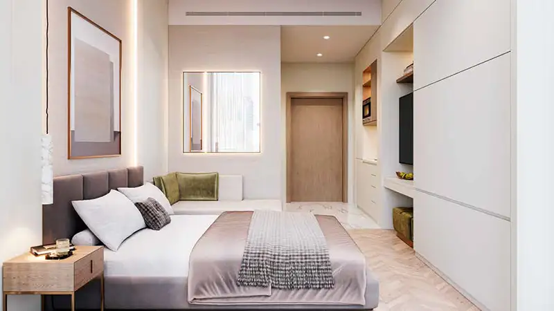 Neoterra Developments presents an exclusive residential masterpiece known as Elmora at Jumeirah Garden City, Dubai, featuring luxurious studios, one-bedroom, and two-bedroom apartments. This low-rise architectural wonder embodies elegance and showcases a design that balances timeless aesthetics with modern appeal. It introduces a unique concept of upscale living, complete with an array of lifestyle amenities and inviting shared spaces, creating a serene oasis that caters to diverse urban lifestyles. Nestled between the sparkling seashore and the vibrant energy of the city, this boutique property is a distinguished part of the esteemed suburban community of Al Satwa. The exterior of this 11-story architectural gem is truly remarkable, exemplifying contemporary style with its smooth curves, soft and luminous tones, and an abundance of striking glass windows, balcony railings, and walls. The entrance is both lavish and grand, featuring the Grande Maison lobby, which is thoughtfully designed with art pieces, natural materials, soft finishes, exceptional lighting, comfortable seating areas, and a central tree as a focal point. The development includes a limited edition of Studio Alcove Residences, which offers generously sized homes. The Solitaire Residences and The Regal Residences represent the pinnacle of architectural typology, available in one and two-bedroom configurations. Each unit is meticulously crafted with cutting-edge details, premium materials, neutral layouts, expansive windows, and thoughtfully designed spaces. Enjoy relaxation and celebration in your spacious living room, while the bedrooms serve as tranquil retreats, bathed in natural light and offering panoramic views of the vibrant surroundings, providing a peaceful environment ideal for privacy and restful stays.