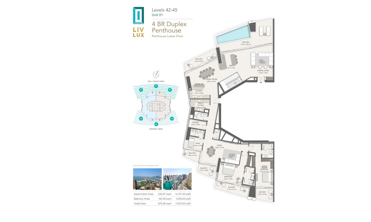 4 Bedroom | - | Duplex, Unit 1, Level 42-45, Lower Floor | 7270.00 Sq Ft | Apartment |