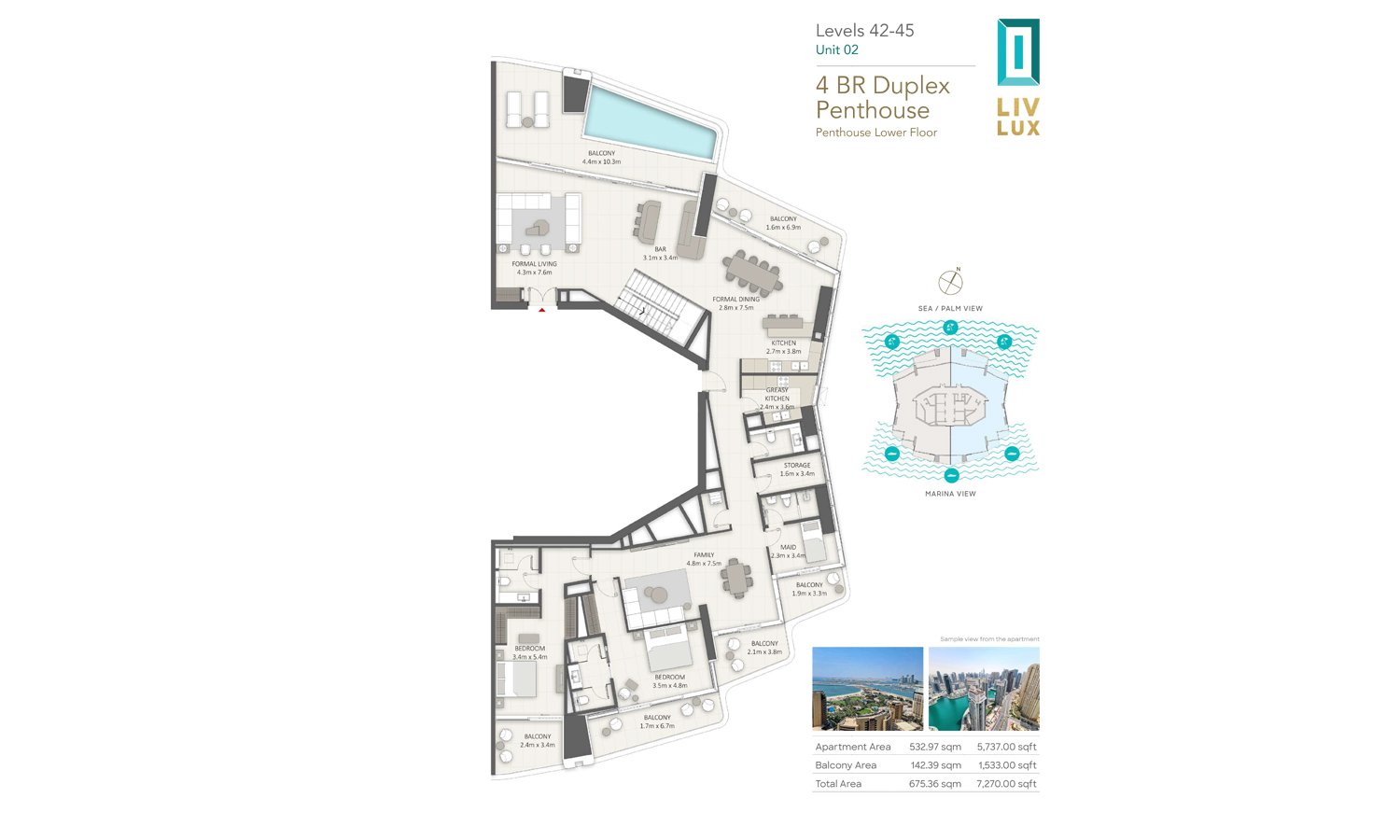 4 Bedroom | - | Duplex, Unit 2, Level 42-45, Lower Floor | 7270.00 Sq Ft | Apartment |