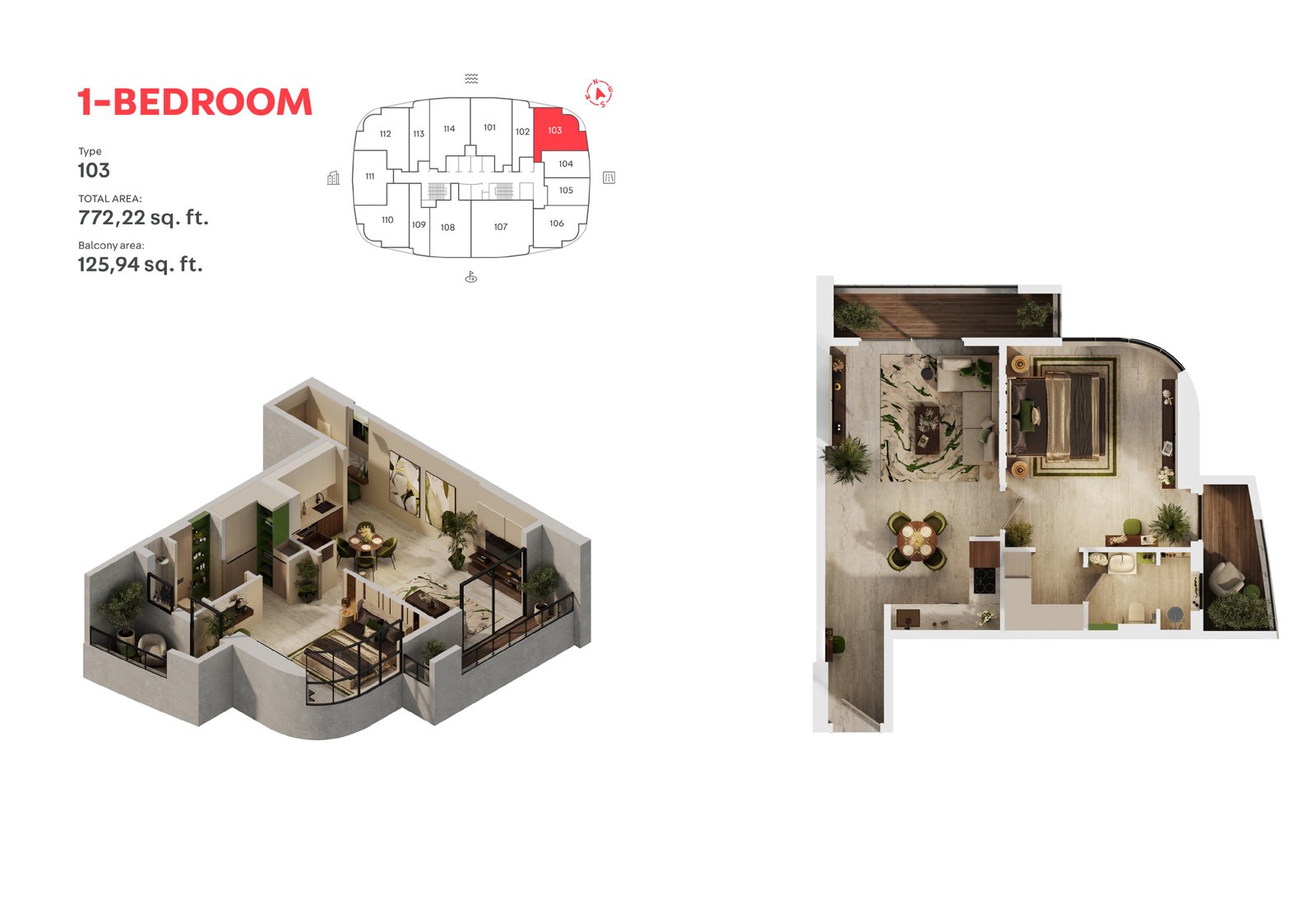 1 Bedroom | - | Type 103 | 772.22 Sq Ft | Apartment |