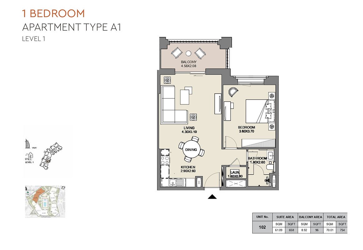 Building 1 | - | Type A1, Level 1, Unit No-102 | 754.00 Sq Ft | Apartment |