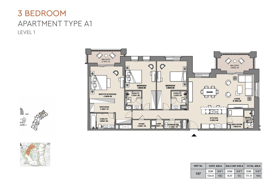 Building 1 | - | Type A1, Level 1, Unit No-107 | 1844.00 Sq Ft | Apartment |