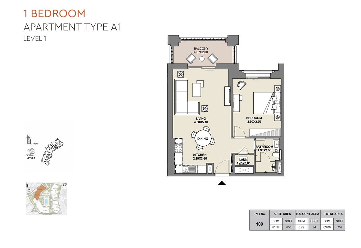 Building 1 | - | Type A1, Level 1, Unit No-109 | 754.00 Sq Ft | Apartment |