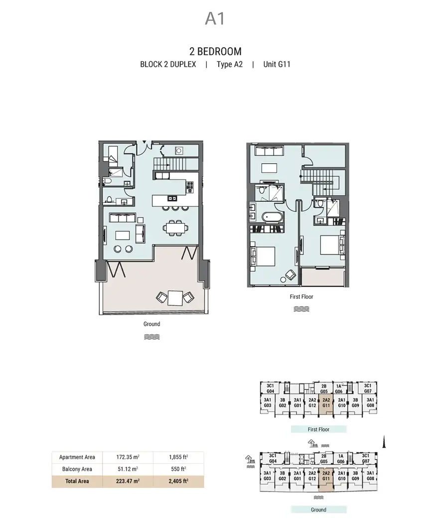 Block 2 Duplex | - | A1, Block 2 Duplex, Type A2, Unit G11 | 2405.00 Sq Ft | Apartment |