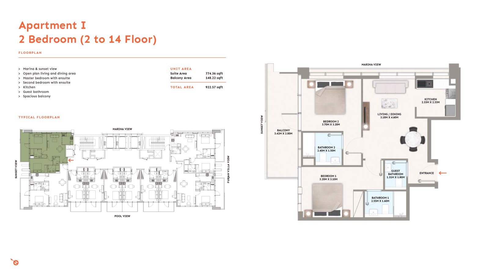 2 Bedroom | - | 2nd to 14th Level | 922.97 Sq Ft | Apartment |