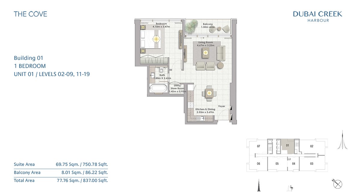 Building 1 | - | 1 Bed-U1-level-02-09,11-19 | 837.00 Sq Ft | Apartment |