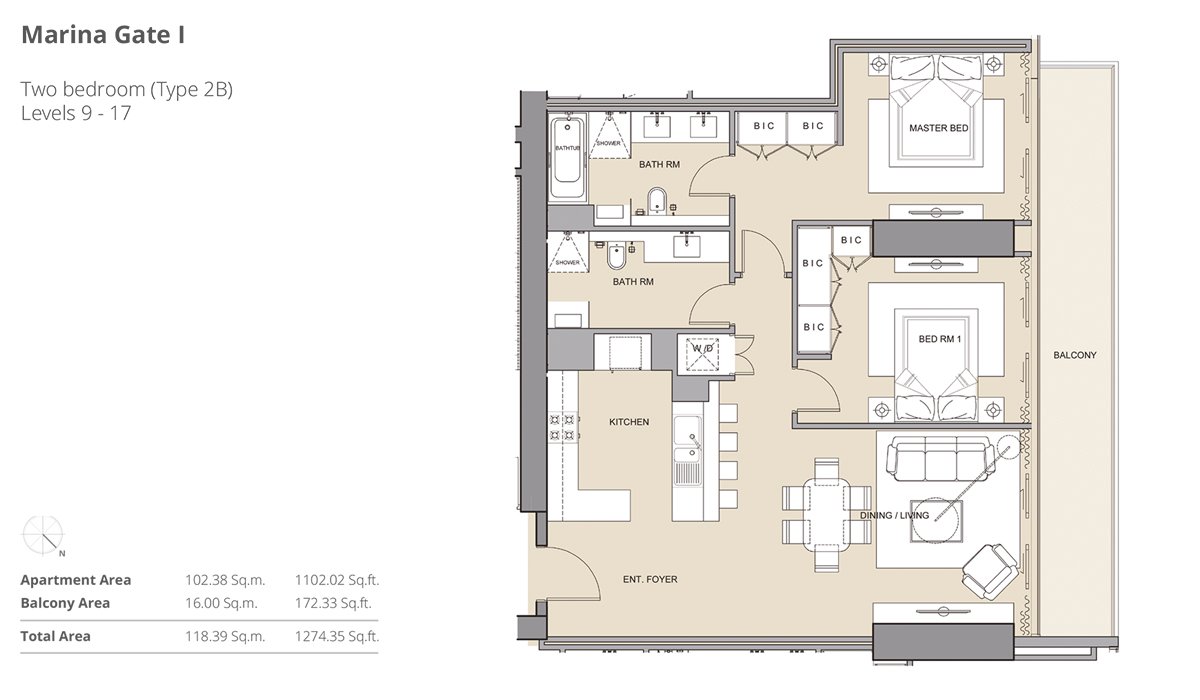 Marina Gate 1 - 2-Bed-type-2-B 1274.35 Sq Ft Apartment