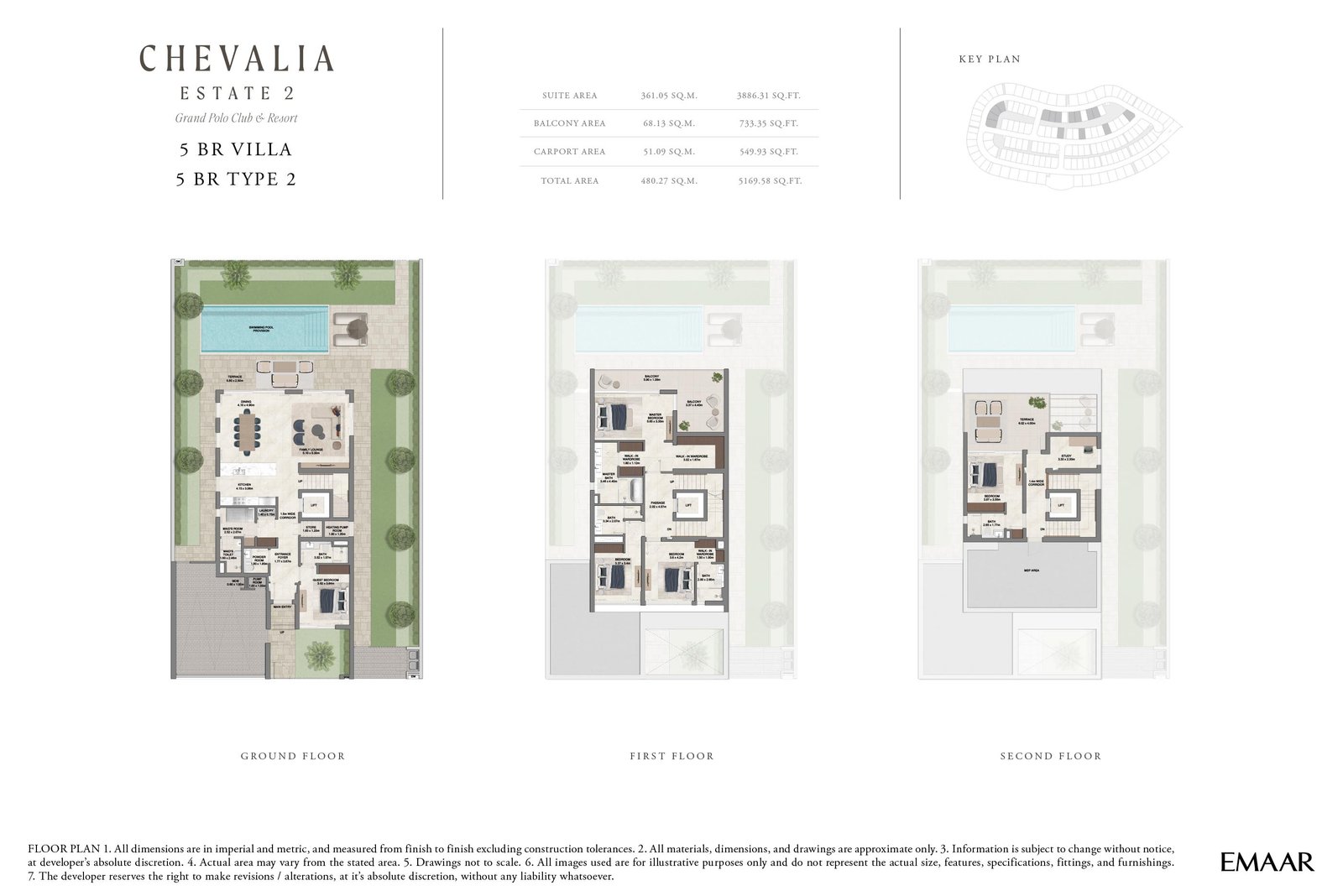 Chevalia Estate 2 at Grand Polo Club & Resort represents the new phase of luxurious living brought to you by Emaar Properties, featuring exclusive class 4 and 5-bedroom villas. From sunrise to sunset, the architecture reveals a harmonious blend of reality and sophistication, inviting you to experience a lifestyle rich in heritage and contemporary elegance. Located within the tranquil surroundings of the Grand Polo Club & Resort, this new chapter is a unique refuge, where each sunset promises a life steeped in beauty. Picture gazing from the expansive windows of your villa, overlooking lush polo fields that stretch towards the horizon, their vibrant greenery shimmering in the golden light. This phase combines modern architectural design with the enduring charm of equestrian tradition, creating a residence that transcends mere living space to become a legacy. The sculptural design is distinctive, achieving a balance between minimalist forms and gracefully textured curves that echo the noble movements of polo horses. Each villa in this exclusive collection boasts generous living spaces on spacious lots, ensuring both privacy and an enhanced sense of openness. Abundant natural light floods in, illuminating polished marble floors that gleam under soft neutral tones, while large terraces and private courtyards beckon you into beautifully landscaped retreats. With ample windows and seamless transitions between indoor and outdoor spaces, every moment is enveloped in beauty and openness. Situated in the lush center of the Grand Polo Club & Resort community, these homes are meticulously designed to reflect exclusivity, privacy, and subtle luxury. Each sunset becomes a celebration, whether enjoyed from the terrace overlooking the fields, in a private garden, or along shaded pathways leading to equestrian trails and polo grounds. This is not just a residence; it is an environment where every day resonates with the essence of luxury, nature, and the vibrant spirit of equestrian life.
