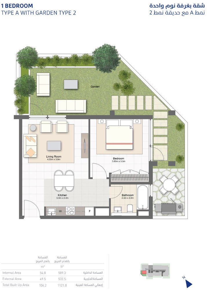1 Bedroom - 1-Bedroom, Type-A ,Garden-Type-2 ,Size-1121.8-Sq-Ft 1121.80 Sq Ft Apartment