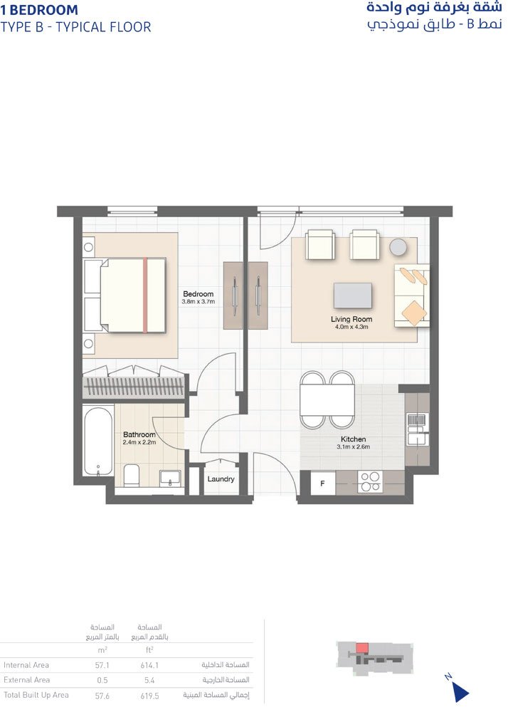 1 Bedroom - 1-Bedroom, Type-B ,Typical-Floor ,Size-619.5-Sq-Ft 619.50 Sq Ft Apartment